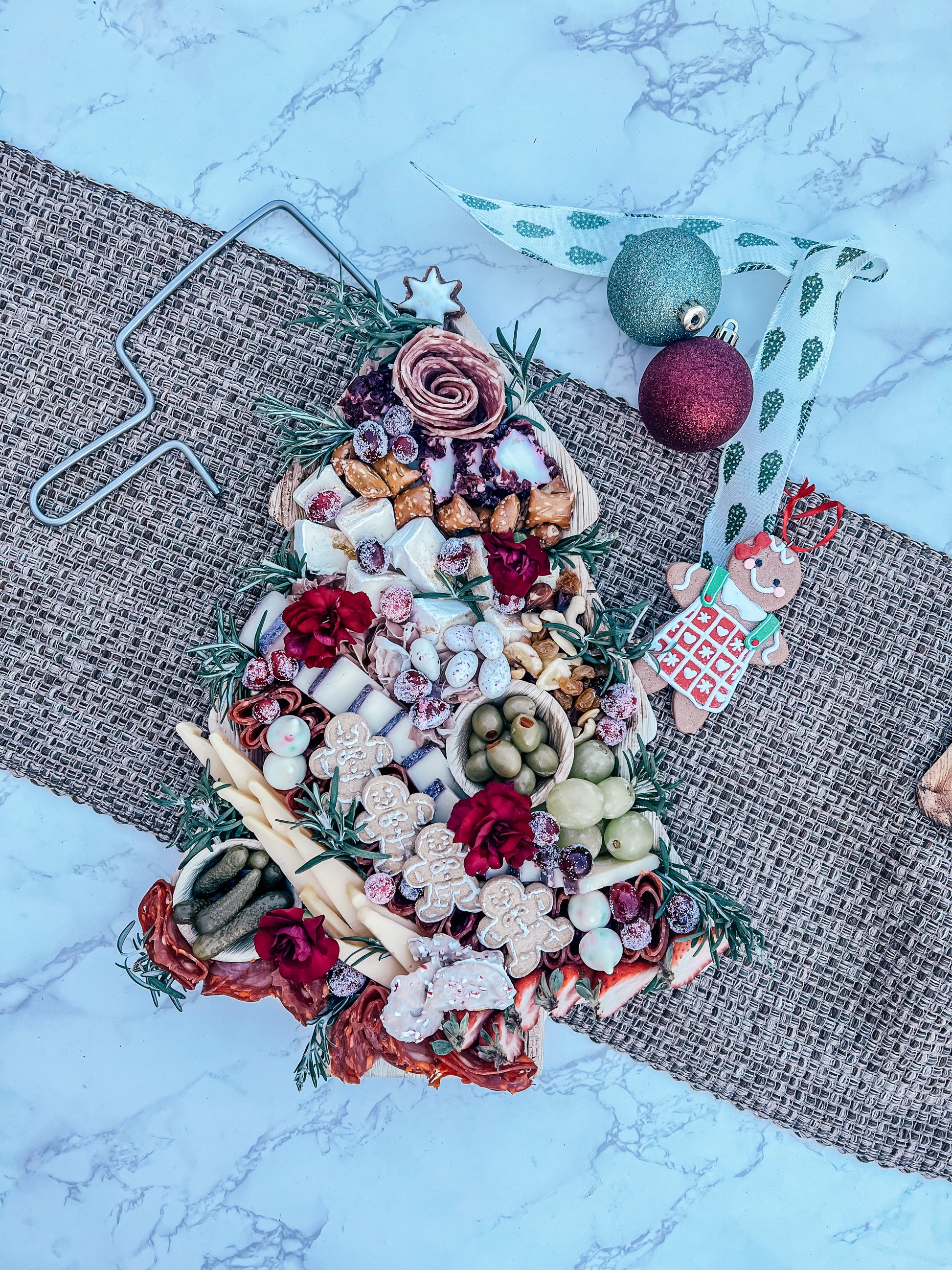 Charcuter-TREE16in eco-friendly disposable Christmas Tree shaped palm leaf tray filled with 4 different cheeses and 4 charcuterie meats as well as an assortment of fresh seasonal fruit, olives & cornichons, nuts, chocolate and holiday themed treats. The Charcuter-TREE is served with crackers, honey & jam on the side and will feed approx. 8 people appetizer sized portions.