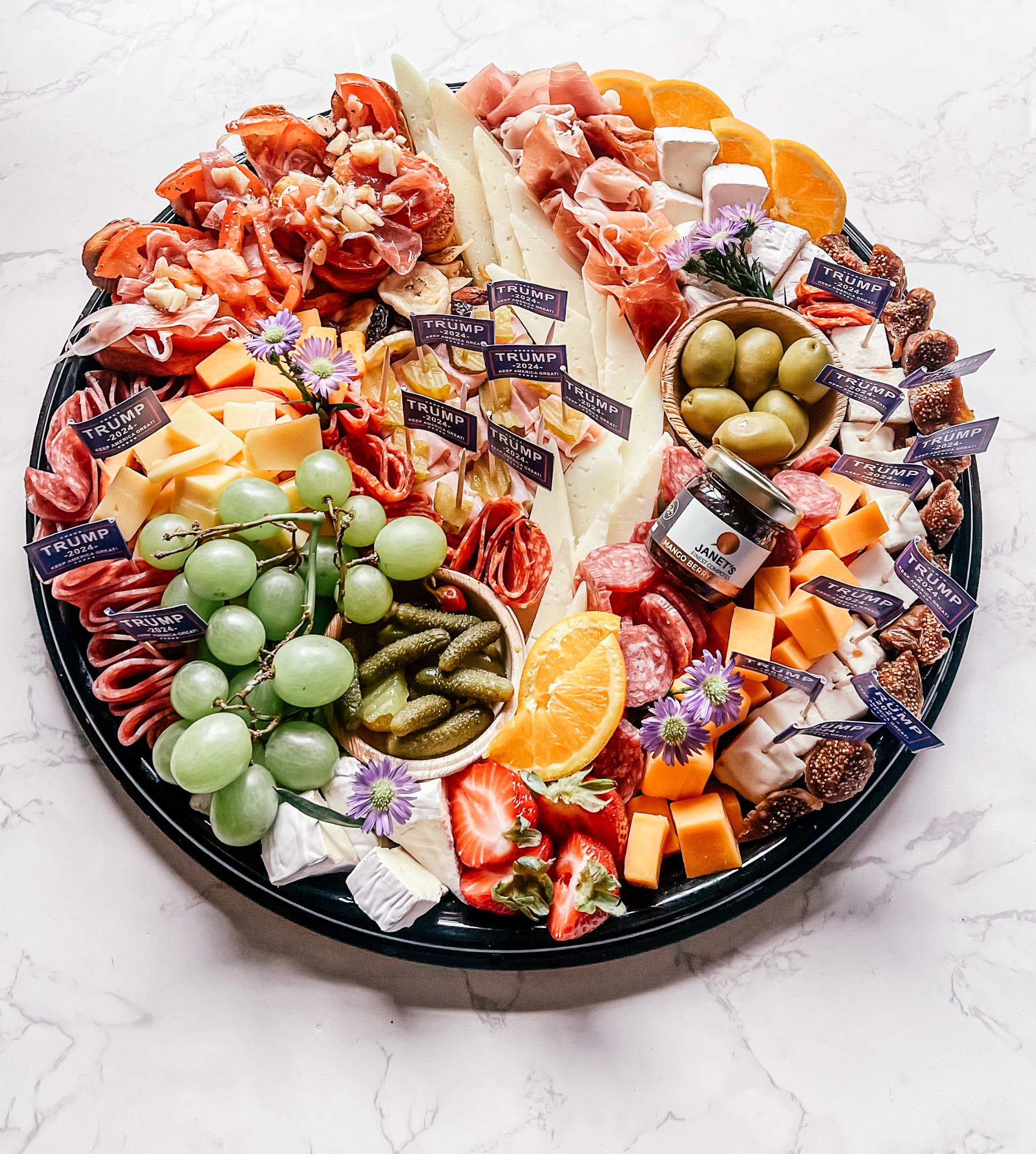 4 cheese 4 meats, fruits, crackers, guava and queso blanco, Cuban sandwich skewers, pan con tomatoes, nuts, dates, olives, pickles
